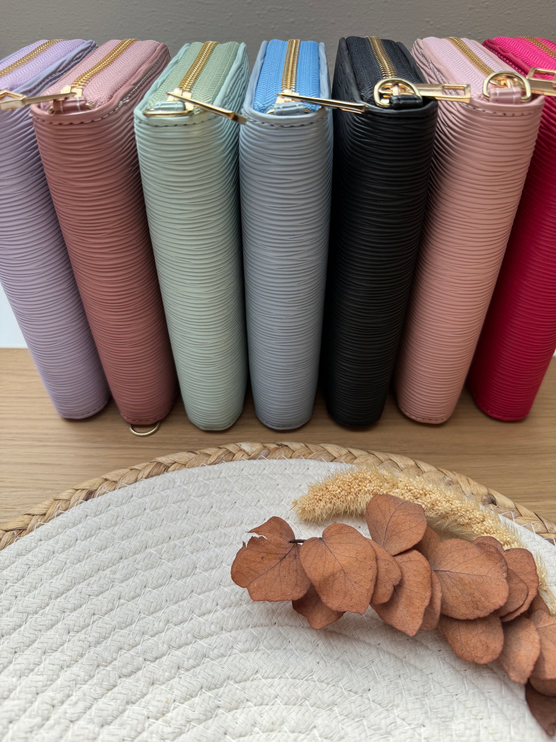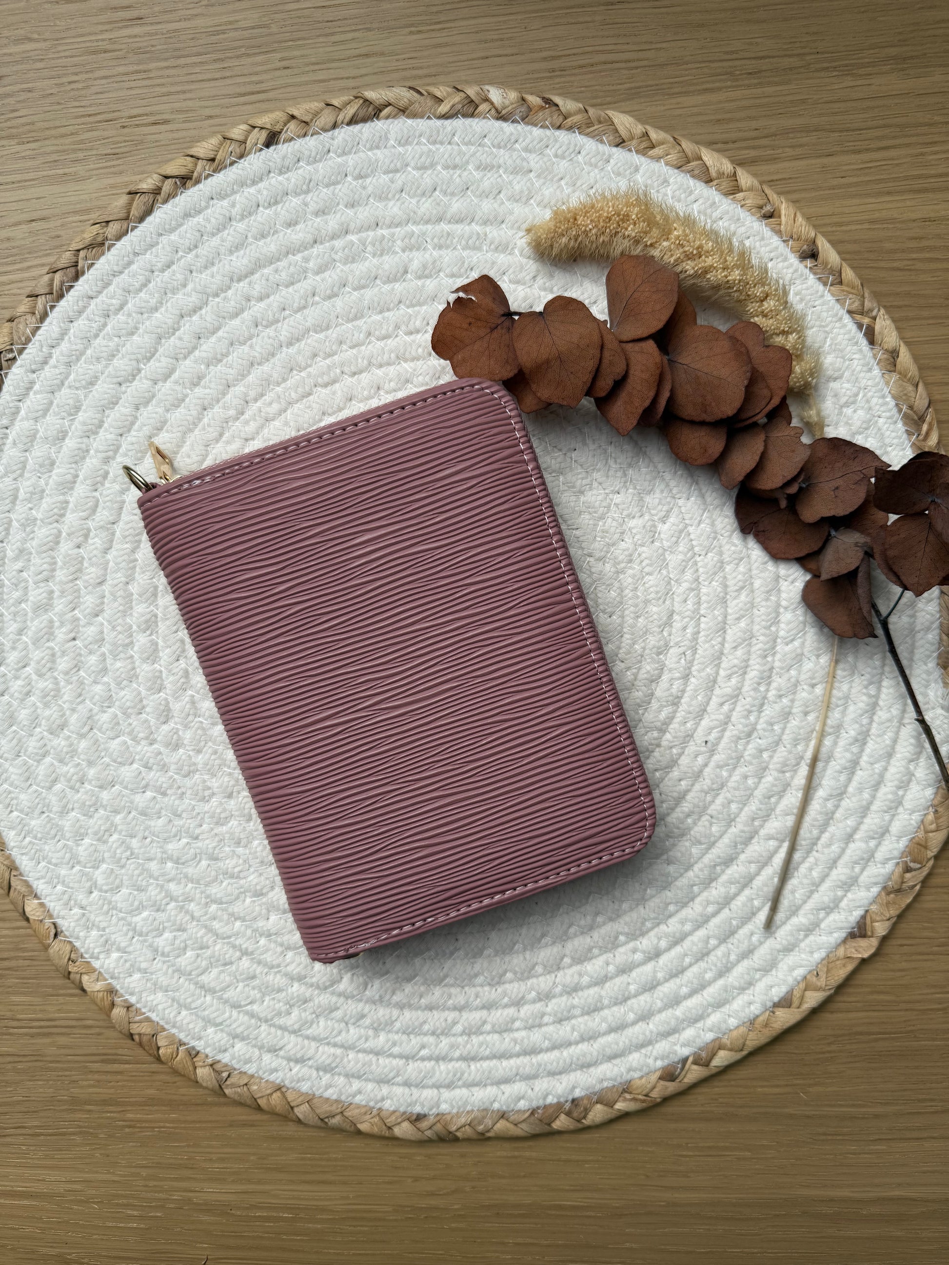 Deze elegante binder is jouw perfecte metgezel voor onderweg. Het enveloppe-ontwerp met ritssluiting zorgt voor een veilige en stijlvolle manier om je geld te bewaren. De unieke ribbelstructuur geeft de binder een moderne en luxueuze uitstraling, terwijl het compacte A7-formaat moeiteloos in je tas past.