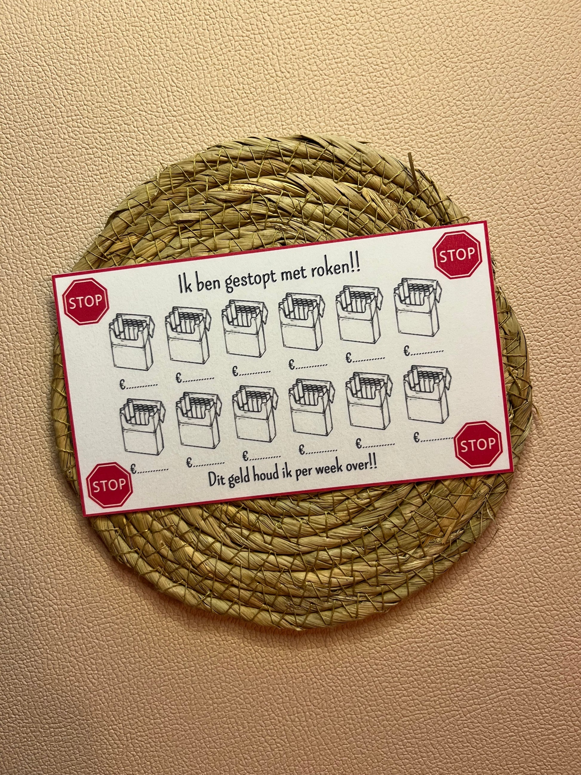 Stop met roken en stop elke week het bedrag wat je eigenlijk aan sigaretten zou uitgeven, in je mapje. Schrijf het bedrag onder pet pakje en kleur het plaatje in. Zo kan je snel zien hoeveel geld je overhoud als je gestopt bent met roken. ZET HEM OP!!!!!