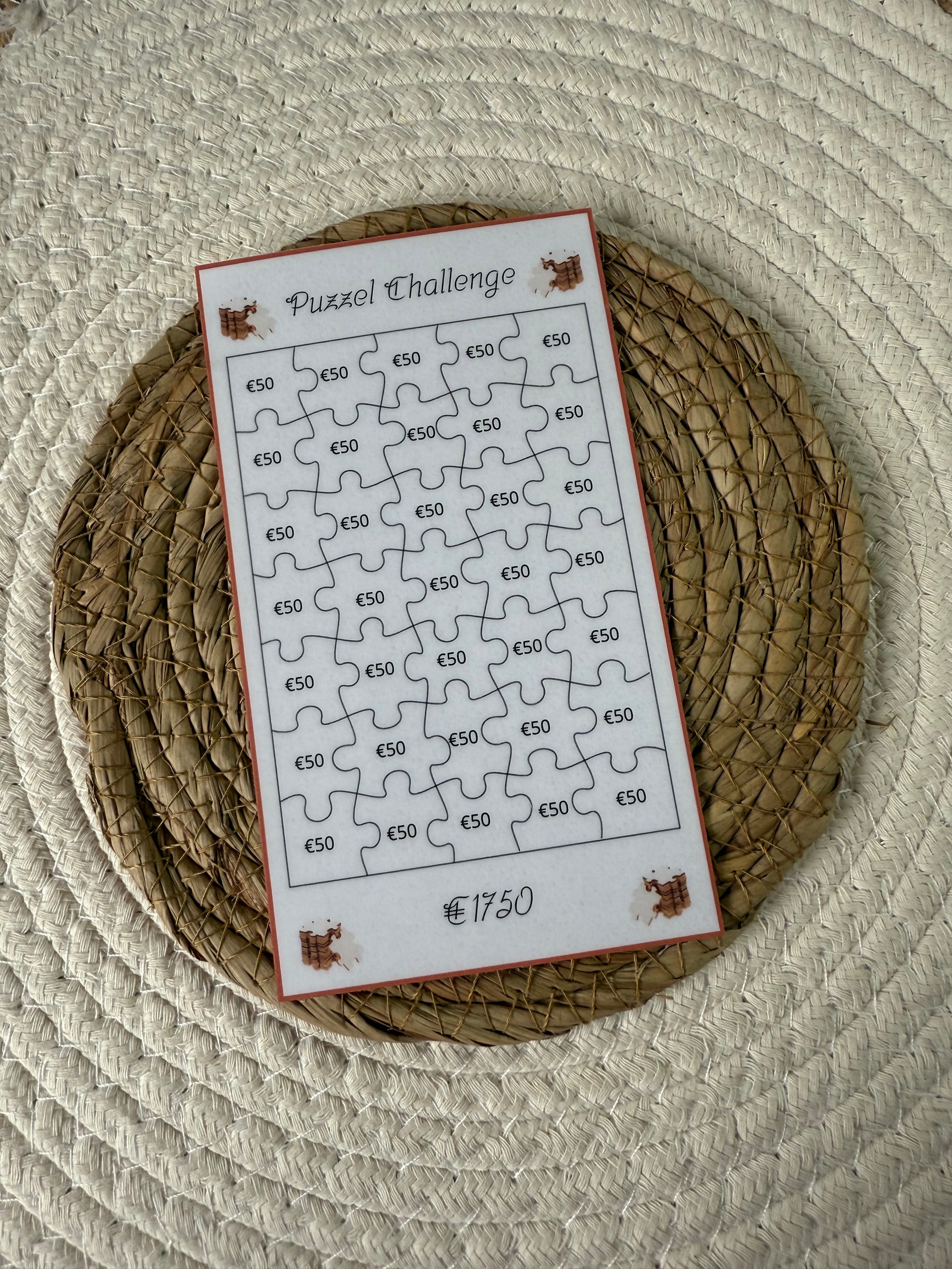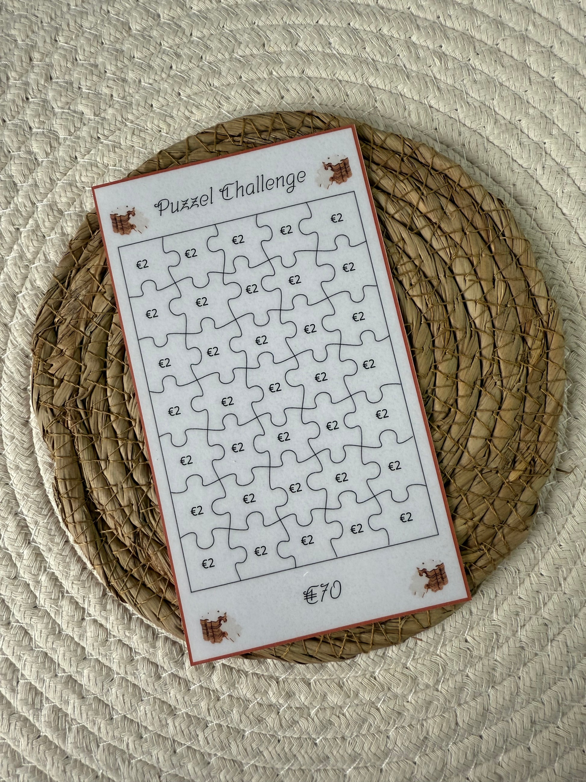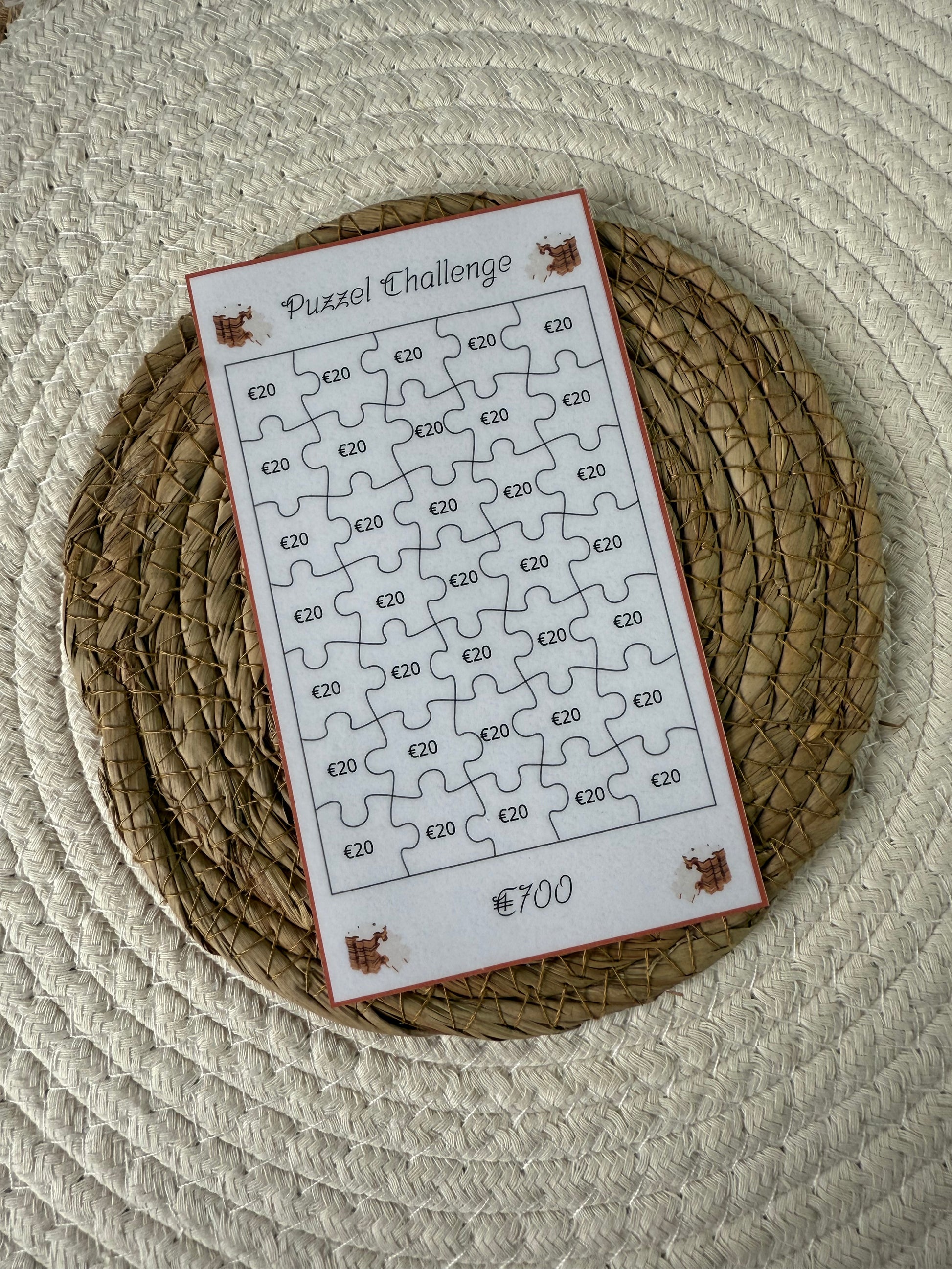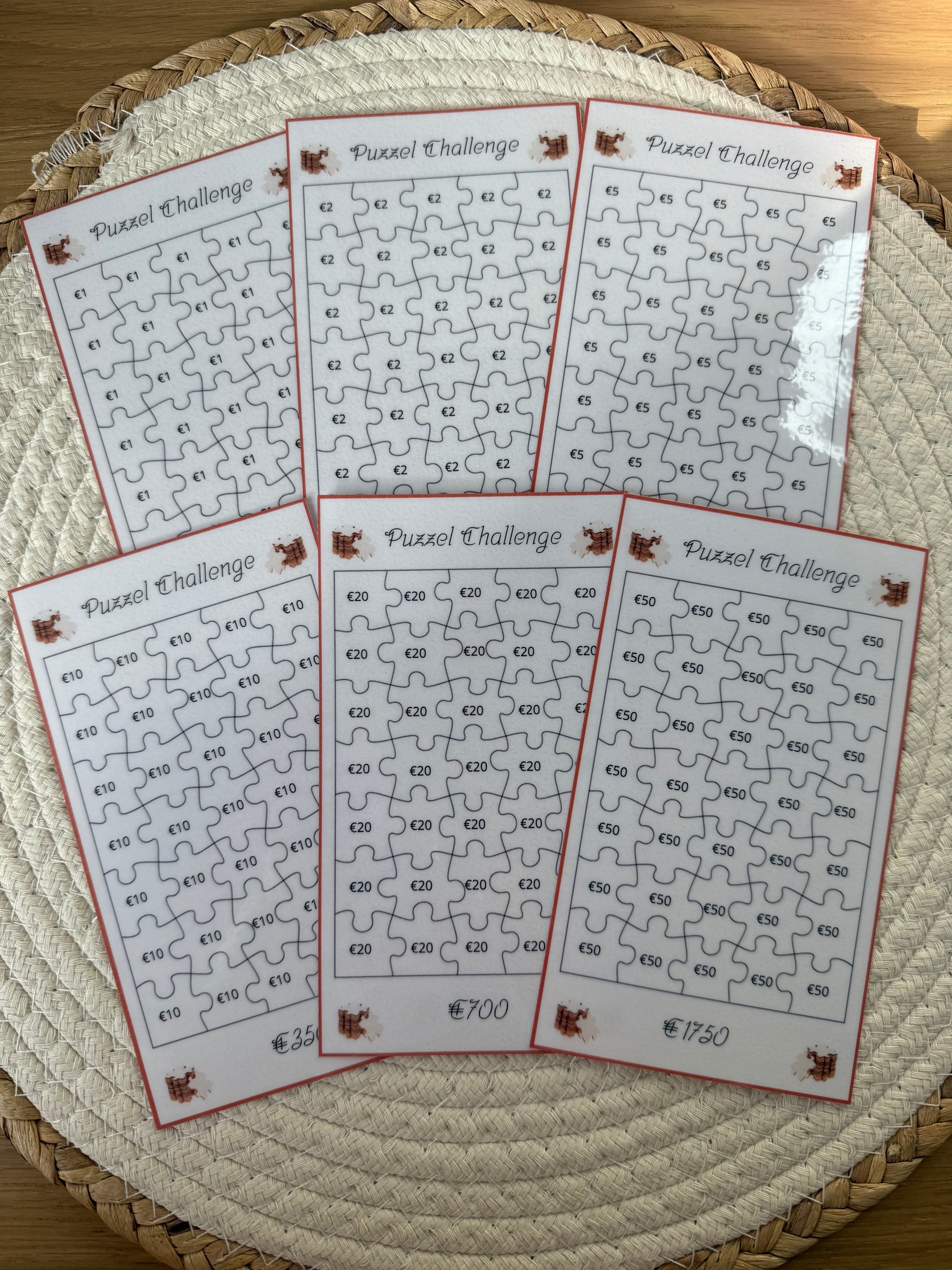 Met deze leuke puzzel challenge set spaar je 1 euro, 2 euro, 5 euro, 10 euro, 20 euro en 50 euro los.