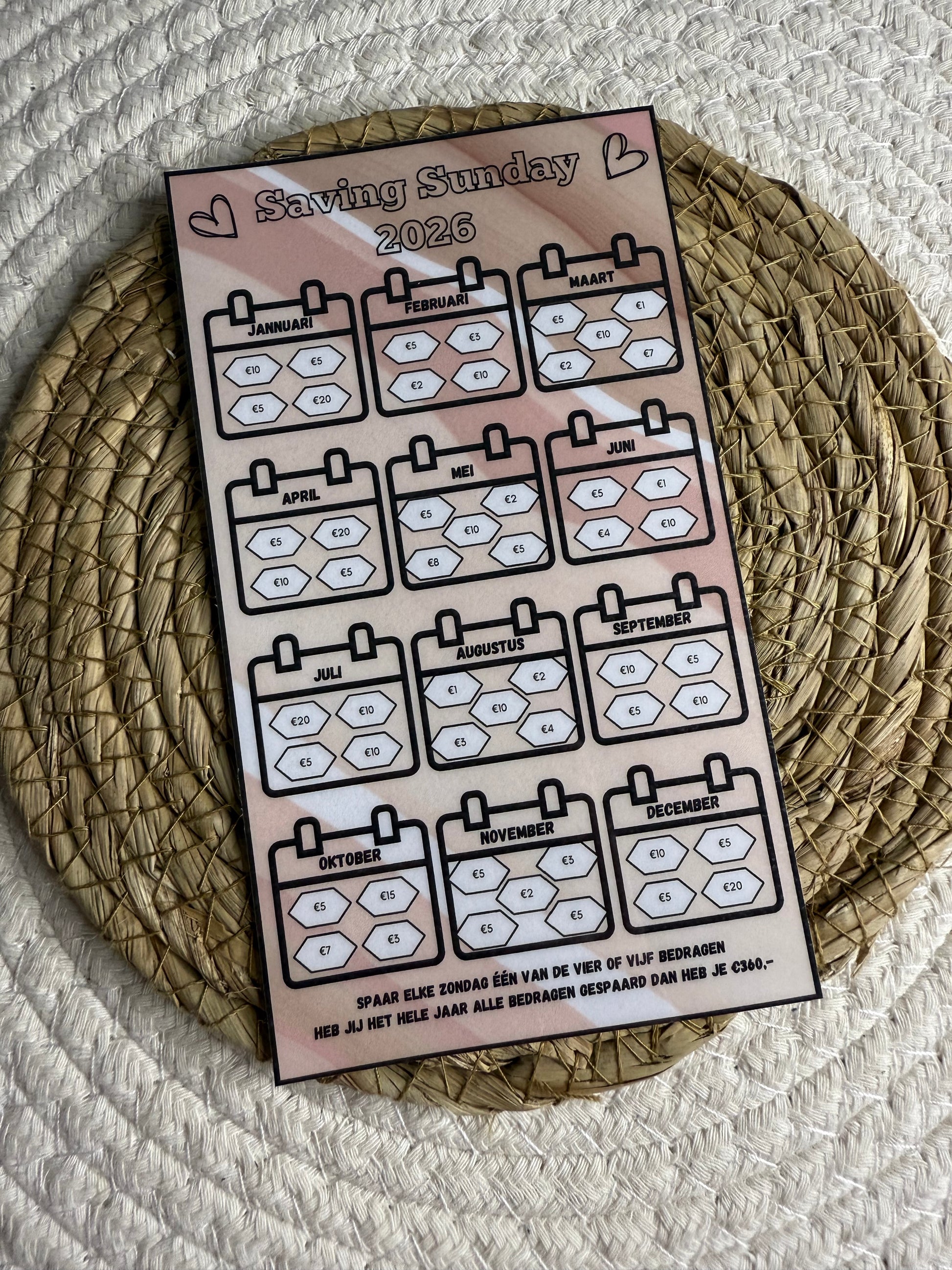 Spaar in 2026 elke zondag een bedrag. Heb je alle bedragen gespaard dan heb je aan het einde van het jaar €360