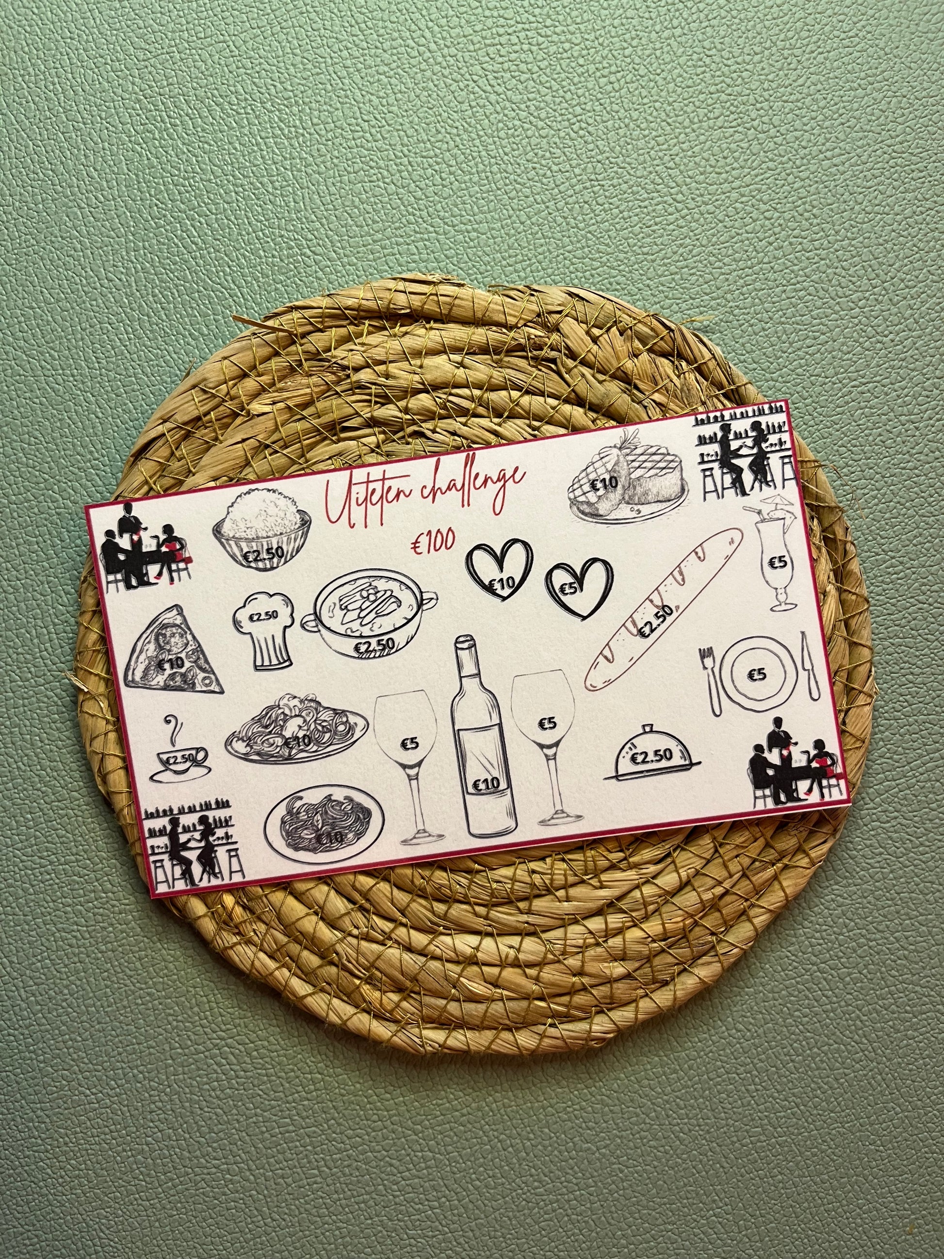 Spaar €100 euro om uit eten te gaan. Elk plaatje dat je inkleurt heeft een ander bedrag. heb jij alles ingekleurd dan heb je €100 euro gespaard en kan je lekker uit eten gaan. EET SMAKELIJK!!