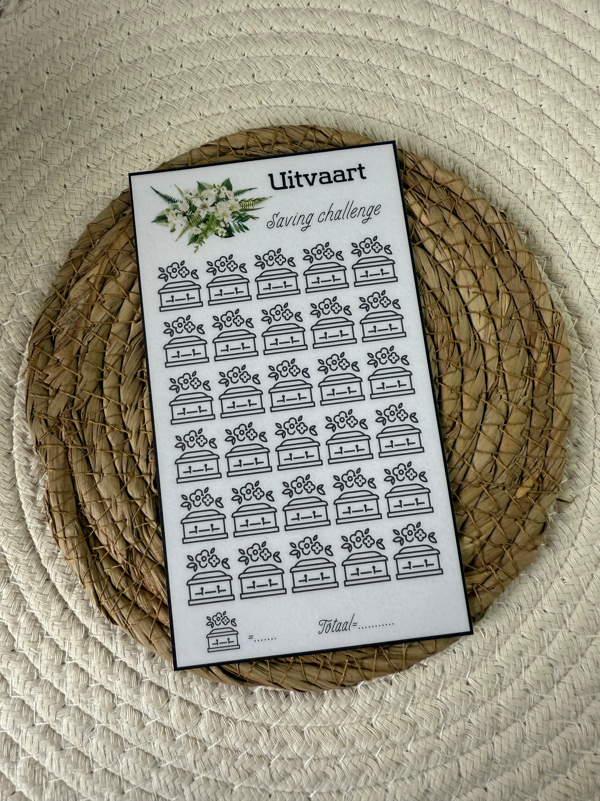 Deze challenge heeft 30 vakjes. Je kan zelf bepalen welk bedrag je spaart per vakje en wat dan het totaal bedrag word. Dus spaar je graag €1 euro per vakje dan kan dat. Maar spaar je graag €20 euro per vakje, dan kan dat natuurlijk ook.